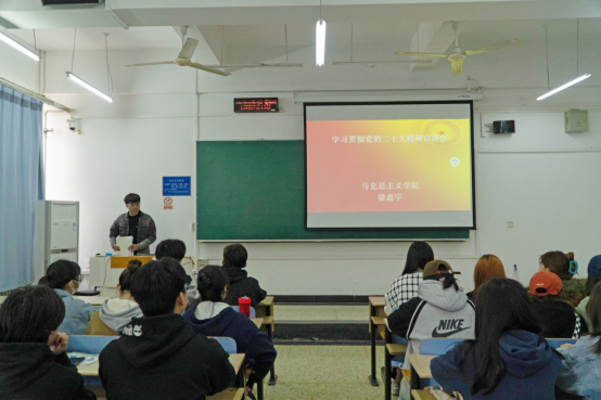 宣讲会上,梁鑫宇结合历史事件和时政案例,从党的二十大主题、过去五年的工作和新时代十年的伟大变革、开辟马克思主义中国化时代化新境界、新时代新征程中国共产党的使命任务等方面对报告各部分进行了详细讲解。最后,他结合党的二十大报告中习近平总书记的青年寄语,勉励同学们在具体学习、工作和生活中,既要坚定理想信念、强化进取精神,又要把握新使命新要求,展现新担当新作为。