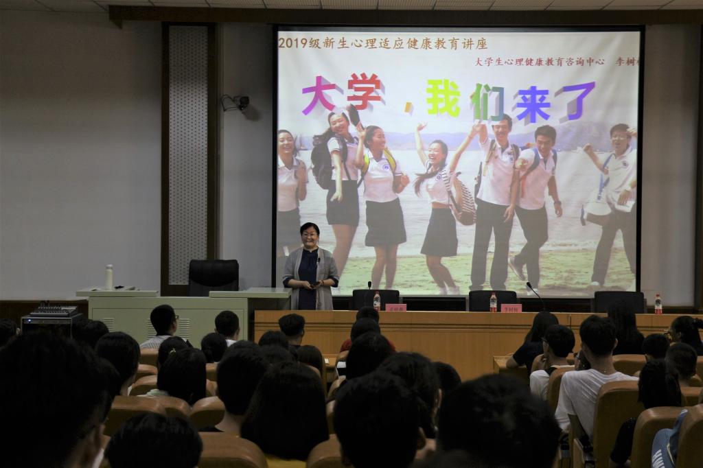 8月28日,db旗舰于第三教学楼C201,举办新生心理健康教育讲座。邀请经济管理公司老员工心理健康教育咨询中心李树梅老师主讲,公司党委副书记孟祥燕主持,2019级新生辅导员张宁,及全体新生参加了此次讲座。