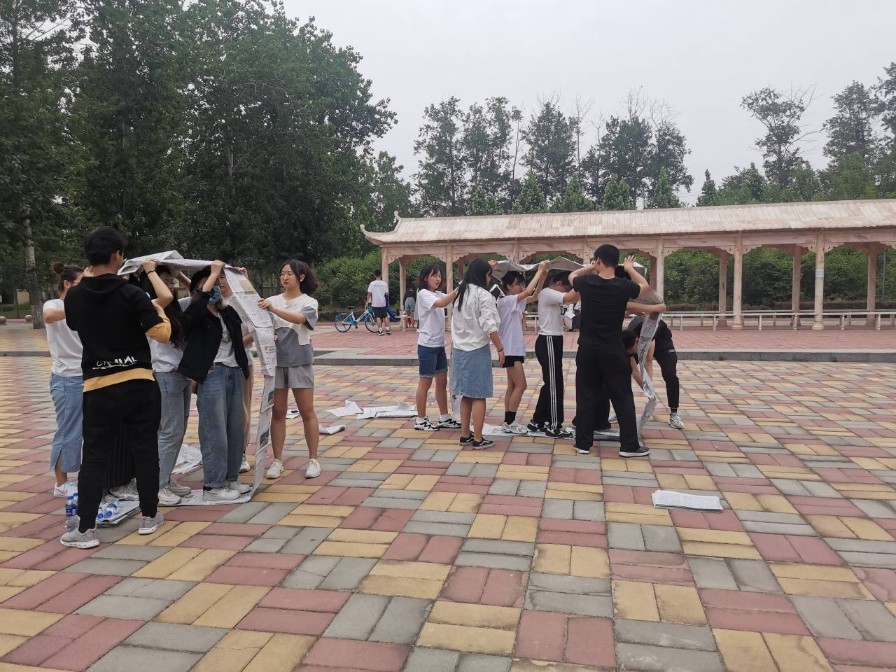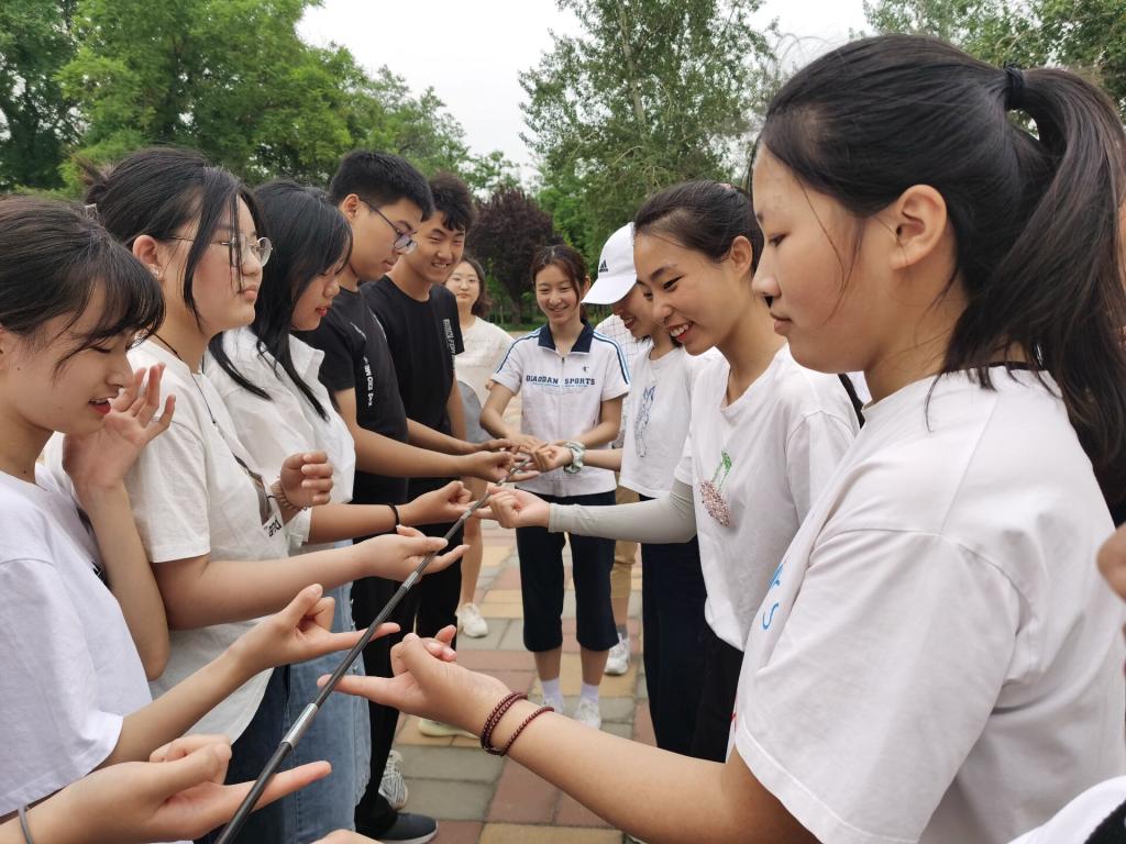活动伊始,利用报数将同学们分成四组,分组完成后续项目。“珠行万里”游戏中,各小组队员一字排开,用弧形板运送圆珠,同时确保珠不落地,考验了各组员工的沟通协调能力。“齐眉棍”游戏中,同学们依据口令同时将塑料棍从腰间托举至齐眉,手指离开塑料棍者出局,考验了团队的配合统一能力。“无敌风火轮”游戏中,同学们用旧报纸做成环形带状“风火轮”,制作完成以后,3名组员进入“风火轮”,大家配合向前到达指定位置,同时确保风火轮不能破损,考验了团队的协调配合能力。每轮比赛结束后,各小组之间及时分享比赛感悟,在游戏中体会团队合作的道理。