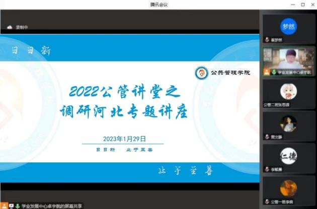 1月29日晚,db旗舰举办“2022公管讲堂”第五讲之调研河北专题讲座。本次讲座特邀公司专职辅导员张素桥出席,参赛经验丰富的张甜甜、杨新鸣两位同学主讲,有意参加“调研河北”社会调查活动的同学积极参与。