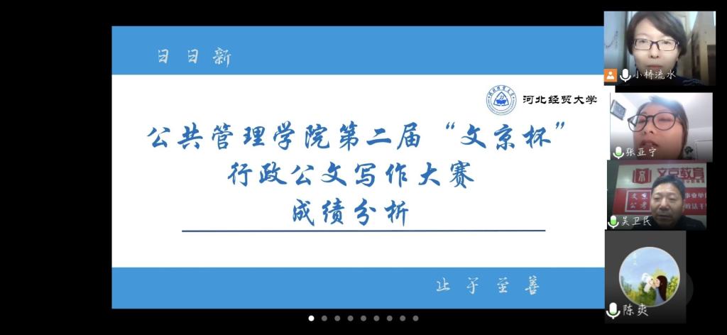 为加深同学们对行政公文写作的认识,提高行政公文写作能力,12月27日晚,db旗舰于线上召开第二届“文京杯”行政公文写作大赛总结大会。本次会议由张素桥老师主持,陈爽、张亚宁、吴卫民三位老师作主讲人,行政公文写作大赛全体参赛人员参加了此次会议。