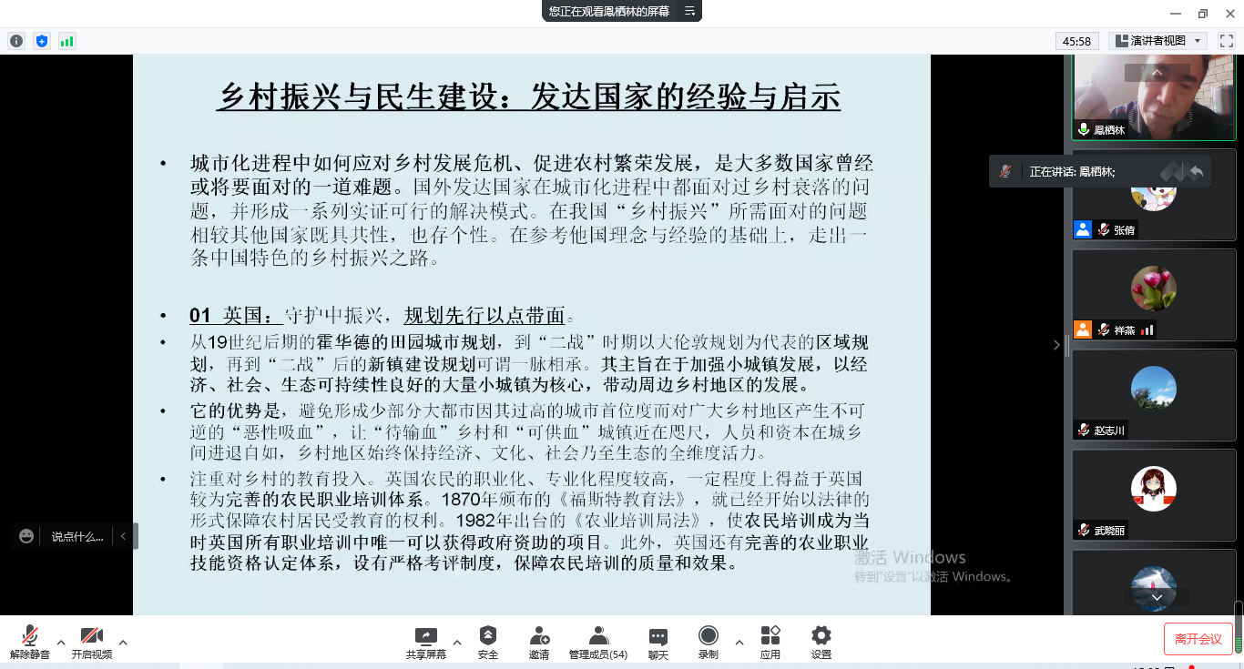 讲座中,蔺丰奇教授旁征博引,对高质量民生和乡村振兴战略进行了全方位解读,并聚焦乡村振兴战略“产业兴旺、生态宜居、乡风文明、治理有效、生活富裕”的总要求,分析了发展高质量民生和完善治理体系、提高治理能力对于推动乡村振兴起到的关键作用。最后结合具体案例对实施乡村振兴战略提出了独到见解和建议。