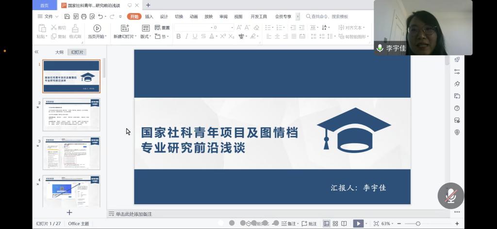 李宇佳首先围绕申报书的各个板块,详细分析了撰写过程中的要点和难点重点,并提出要提高自己的发现问题能力、信息获取能力、信息分析能力,要注重从工作实践、课题指南、自身专业、学术交流中选取适合自己的选题。然后,李宇佳博士结合自己的学术成果,分享了图情档学科的前沿热点和研究方法,以及对于图情档学科与其他学科交叉融合研究思路的发现与探索。