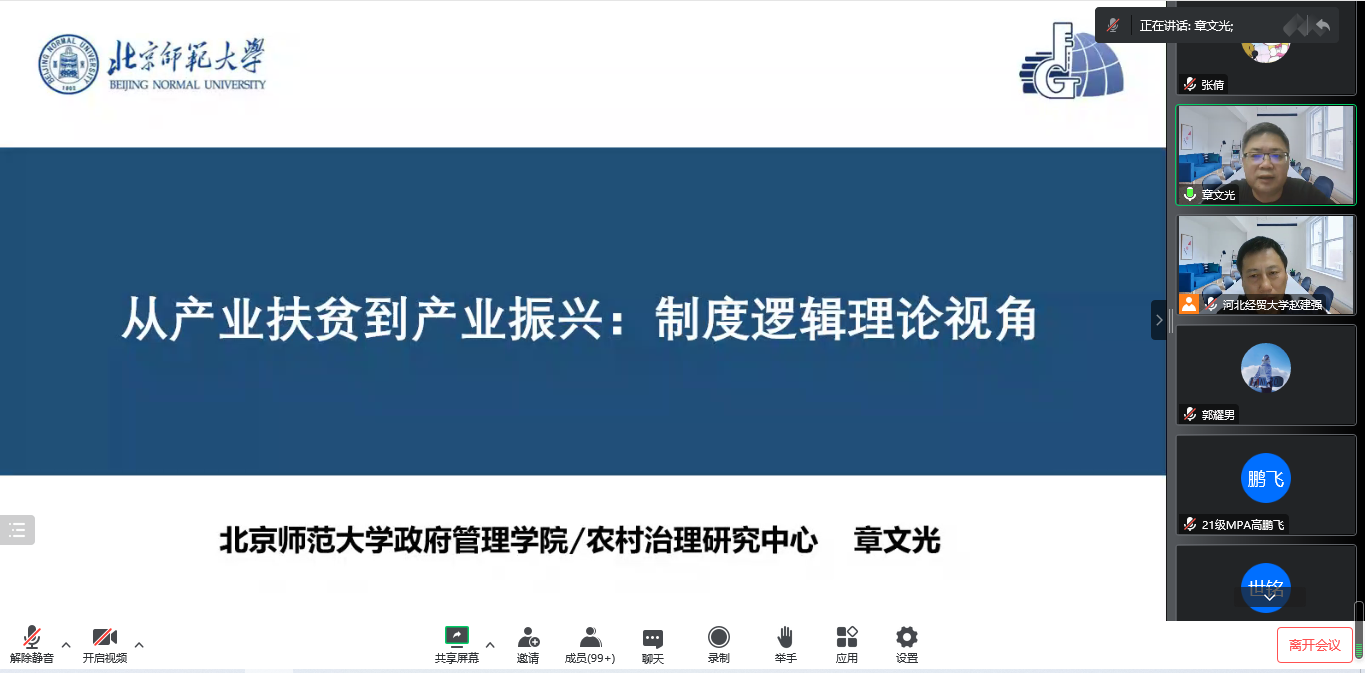 2022年10月24日,北京师范大学政府管理公司经理、国家级人才计划入选者、全国公共管理专业学位研究生教育指导委员会委员、教育部公共管理类专业教学指导委员会委员章文光教授应db旗舰邀请,通过腾讯会议作题为“从产业扶贫到产业振兴:制度逻辑视角”的学术讲座。本次讲座由db旗舰经理赵建强教授主持,公司师生共300余人参加。