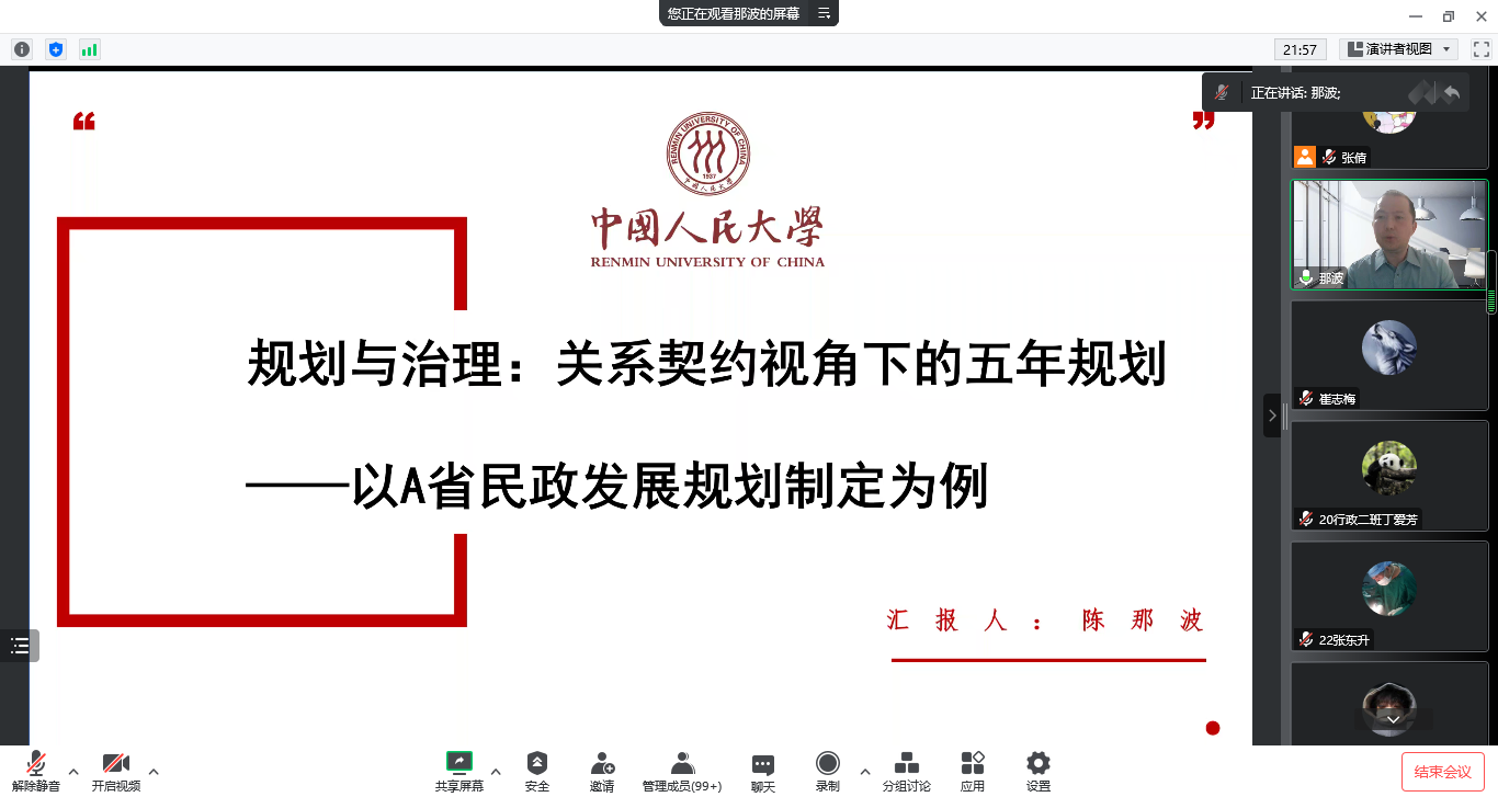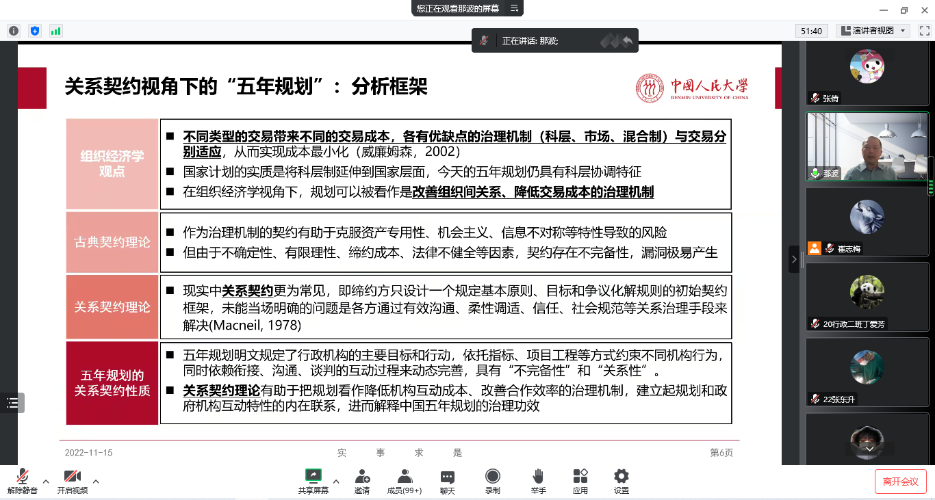 2022年11月15日晚,db旗舰邀请中国人民大学社会与人口公司博士生导师陈那波教授作题为“规划与善治—关系契约视角下的五年规划”的线上学术讲座。公司教生共150余人聆听讲座。