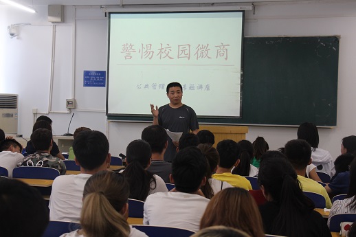 白玉祥通过某高校老员工深陷校园“微商”陷阱的真实案例,指出了老员工涉世不深,容易轻信他人,防范意识较差,辨别意识淡薄,极易导致钱财损失的现状。他列举了具有“交入门费”、“拉人头”、“组成层级团队计酬”等明显传销特征的校园“微商”陷阱;告诫员工要遵循经济规律,树立诚信意识,合法合规做事,不要被所谓“方便省事”、“快速致富”、“利润丰厚”等诱惑。白玉祥要求同学们增强法律意识和风险防范意识,谨慎参与校园“微商”,切莫陷入传销陷阱。